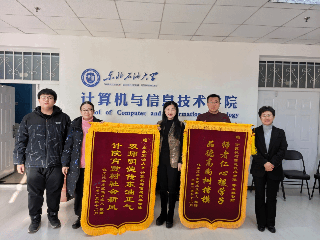家长赠锦旗,师爱暖人心。12月12日,化工24级1班李宣逸及家长走进计算机学院,将写有“双师明德传东油正气,计院育贤树社会新风”和“师者仁心援学子,品德高尚树楷模”两面锦旗赠送给学院及韩玉祥老师。