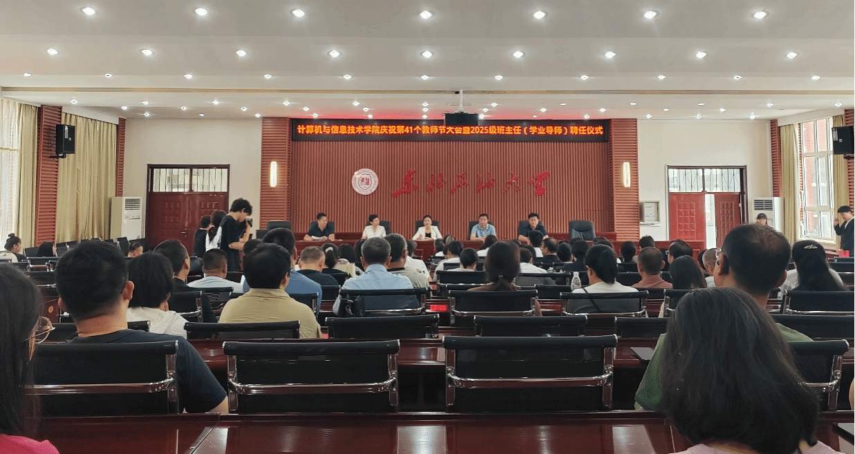 大会在庄严的国歌声中拉开帷幕。诗朗诵《颂师恩》表达了计算机学院学子对老师的感恩与美好祝愿。新进教师举起右拳,庄严宣誓,表达了新教师们恪守师德规范、践行育人使命、献身教育事业的坚定决心。会上,学院领导为2025级班主任(学业导师)颁发了聘书,并提出了具体要求。