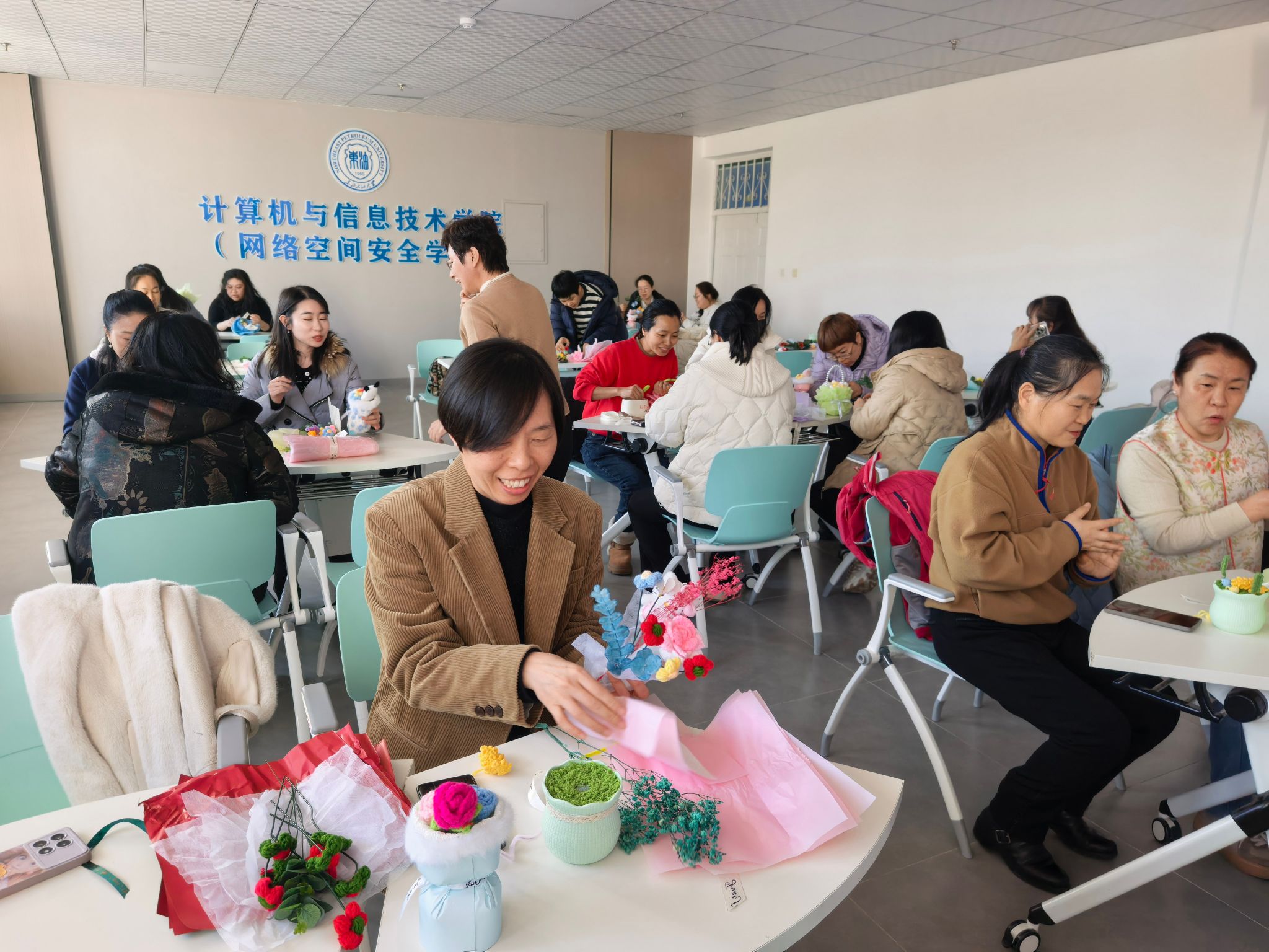 在第116个“三八”国际妇女节来临之际,为丰富学院女教师精神文化生活,彰显巾帼风采,传递学院关怀,3月6日,计算机学院在一教D座305会议室,以“花样巾帼展风采、巧手编织幸福花”为主题,精心组织开展三八节女教师手工编织活动,全体女教师齐聚一堂,以指尖匠心编织美好,共庆专属佳节,共度温馨时光。
